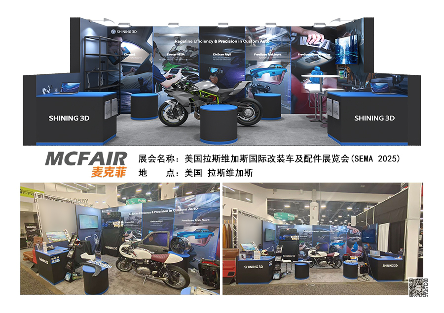 本届展会,麦克菲展览EASY提供了美国拉斯维加斯国际汽车零部件展览会(AAPEX 2025)展位搭建服务,同时也为SHINING 3D提供了美国拉斯维加斯国际改装车及配件展览会(SEMA 2025)展位搭建服务,现场如期完工,并交付客户使用。